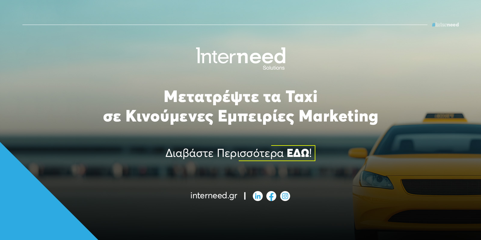 Στην Interneed, με εξειδίκευση στη μετατροπή των taxi σε δυναμικά οχήματα branding, είμαστε δίπλα σας για να μεταφέρετε το μήνυμά σας κατευθείαν στους δρόμους. Από την ιδέα μέχρι την υλοποίηση, είμαστε δίπλα σας για να διασφαλίσουμε την επιτυχία της καμπάνιας σας.
